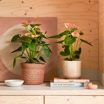 The Anthurium 'Pink' showcases soft, blush-colored spathes that add a gentle, elegant touch to any indoor space.