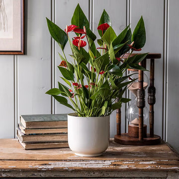 The Anthurium 'Red' features bold, glossy red spathes that instantly brighten any space with their vivid color.