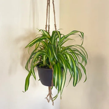 The Spider Plant 'Hawaiian' has beautiful variegated leaves in a more compact size, perfect for smaller spaces like shelves or tabletops.